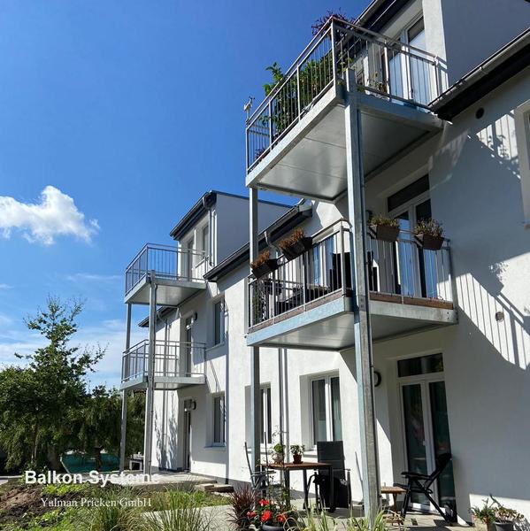 Stahl-Balkone mit 2 Stützen gartenseitig an einem Neubau mit Stahlbetondecke